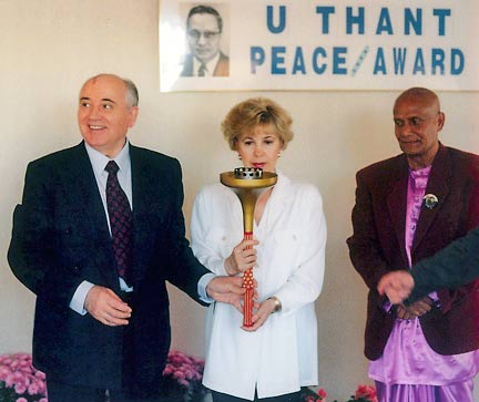 In 1994, Sri Chinmoy awarded President Gorbachev the U Thant Peace Award. In the above picture, President Gorbachev is holding the Sri Chinmoy Oneness-Home Peace Run torch with his wife Raisa Maximovna.